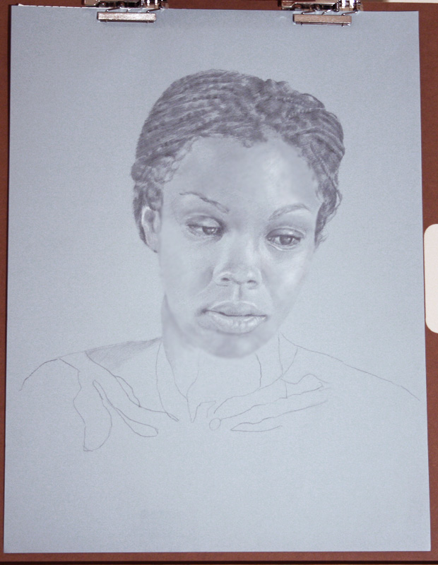| Description | Work in progress of Miriam. Pencil and White Chalk on Blue Paper (18x25 inches) |